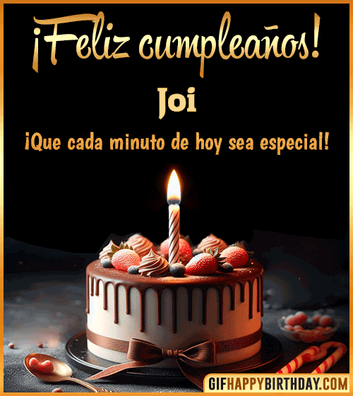 Un encantador GIF de cumpleaños para felicitar a Joi con dulzura y alegría. 🎉🍰 El pastel de fresas con su vela encendida ilumina un mensaje lleno de buenos deseos: “¡Que cada minuto de hoy sea especial!” Ideal para enviar por WhatsApp, Facebook o Instagram y compartir un saludo lleno de cariño, color y celebración.
