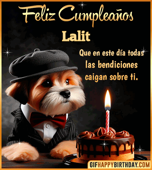 Un GIF lleno de ternura y buenos deseos para celebrar el cumpleaños de Lalit. 🎉🐾 El simpático perrito, vestido con elegancia, acompaña un delicioso pastel de chocolate con una vela encendida, mientras transmite un mensaje lleno de cariño: “Que en este día todas las bendiciones caigan sobre ti.” 🌟 Perfecto para enviar por WhatsApp, redes o mensajes personales con un toque dulce y emotivo. 🎂