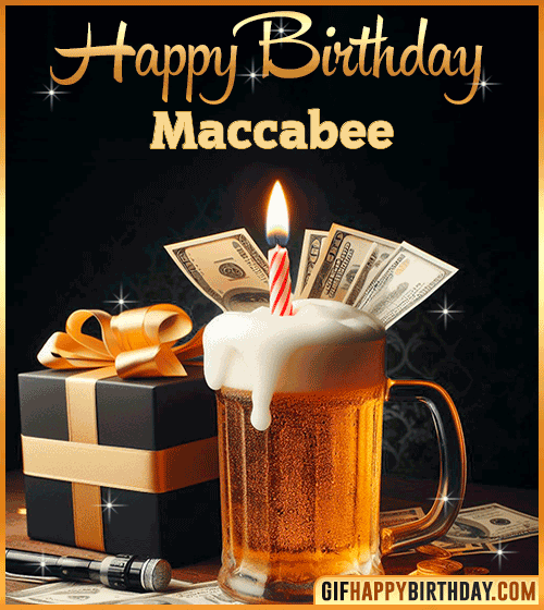 Raise a toast to Maccabee with this stylish and funny Happy Birthday GIF! 🍻💵 A cold beer topped with a candle, dollar bills, and a wrapped gift — the perfect combo for fun, luck, and good vibes. Ideal for sending to friends who love to celebrate with style and a drink in hand! 🎉🎁