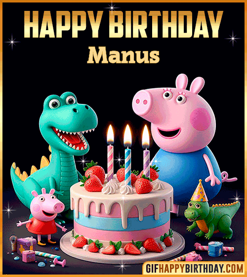 Bring smiles to Manus’s special day with this adorable Peppa Pig Happy Birthday GIF! 🐷🎂 Perfect for kids and Peppa fans, it shows Peppa and her friends celebrating around a delicious cake with balloons, gifts, and joy. A fun and colorful way to send happy wishes online! 🎉
