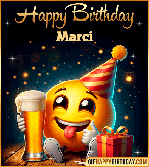 Celebrate Marci’s birthday with this funny emoji Happy Birthday GIF! 🍻😄 The cheerful emoji raises a beer in one hand and holds a wrapped gift in the other — perfect for sending fun, laughter, and good vibes on this special day. Ideal for friends who love to party and smile big! 🎉