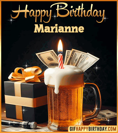 Raise a toast to Marianne with this stylish and funny Happy Birthday GIF! 🍻💵 A cold beer topped with a candle, dollar bills, and a wrapped gift — the perfect combo for fun, luck, and good vibes. Ideal for sending to friends who love to celebrate with style and a drink in hand! 🎉🎁