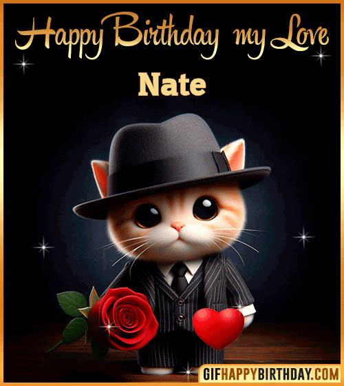 Surprise your special someone with this romantic Happy Birthday GIF! 💕🐾 A charming kitten dressed elegantly with a rose and heart sends warm, loving wishes to Nate. Perfect to express affection, sweetness, and deep love on their special day. 🌹