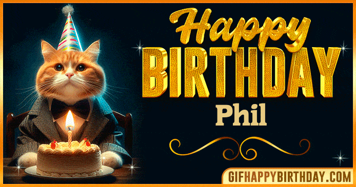 Celebrate Phil’s special day with this elegant Happy Birthday GIF — a classy cat in a bow tie enjoying a birthday cake under warm lights. Perfect to share love, smiles, and birthday wishes! 🎂