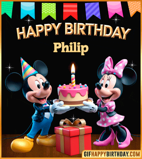 Brighten Philip’s special day with this cheerful Happy Birthday GIF — Mickey and Minnie Mouse smiling beside a festive cake, balloons, and presents. Perfect for sharing fun birthday vibes with friends and family! 🎂🎁🎈