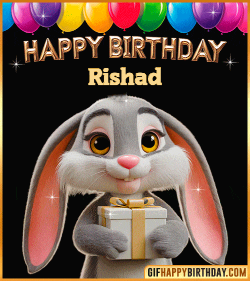 A charming animated GIF featuring a sweet bunny wishing Rishad a Happy Birthday! 🎈 The cute rabbit, with big sparkling eyes and a friendly smile, holds a beautiful present wrapped with a golden bow. Perfect for sending warm and cheerful birthday wishes to kids or animal lovers.