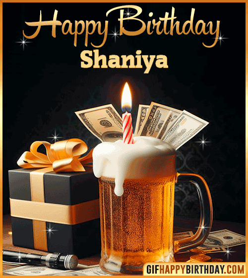 Raise a toast to Shaniya with this stylish and funny Happy Birthday GIF! 🍻💵 A cold beer topped with a candle, dollar bills, and a wrapped gift — the perfect combo for fun, luck, and good vibes. Ideal for sending to friends who love to celebrate with style and a drink in hand! 🎉🎁