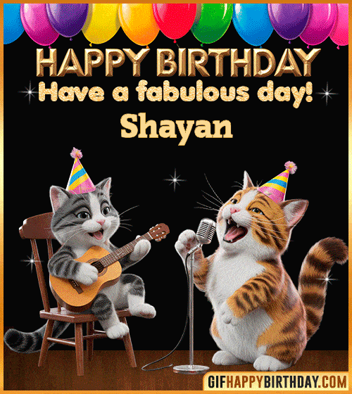 A hilarious and heartwarming animated GIF featuring two adorable cats putting on a musical performance to celebrate Shayan’s birthday! 🎶🐾 One cat strums the guitar while the other sings passionately into a microphone, both dressed in party hats with vibrant balloons overhead. Perfect for sharing with cat lovers or anyone who enjoys a fun and cheerful birthday surprise.