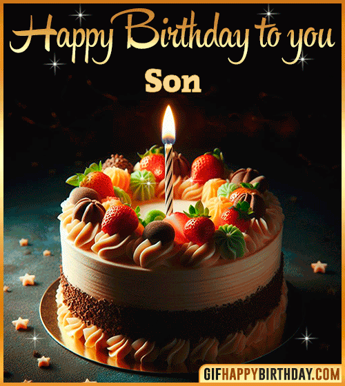Send sweet wishes to Son with this beautiful Happy Birthday GIF! 🍓🎂 A creamy cake topped with strawberries and chocolate, glowing softly with a single candle — perfect to share warm birthday greetings full of love and joy. Ideal for messages, posts, or to make someone’s day extra special!