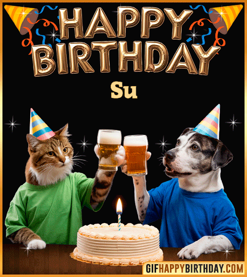 Make Su’s day brighter with this adorable Happy Birthday GIF — a charming dog and cat dressed up for the party, ready to celebrate with joy, cake, and friendship! 🎉