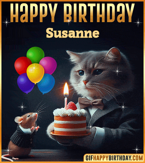 Make Susanne’s day brighter with this adorable Happy Birthday GIF — a charming dog and cat dressed up for the party, ready to celebrate with joy, cake, and friendship! 🎉