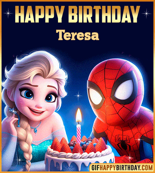 Make Teresa’s birthday magical with this one-of-a-kind Happy Birthday GIF! 🎂✨ Elsa and Spider-Man come together to share smiles, a sweet cake, and colorful energy. Perfect for kids and fans who love heroes and fairy-tale moments — share it to spread fun and happiness! 🎉