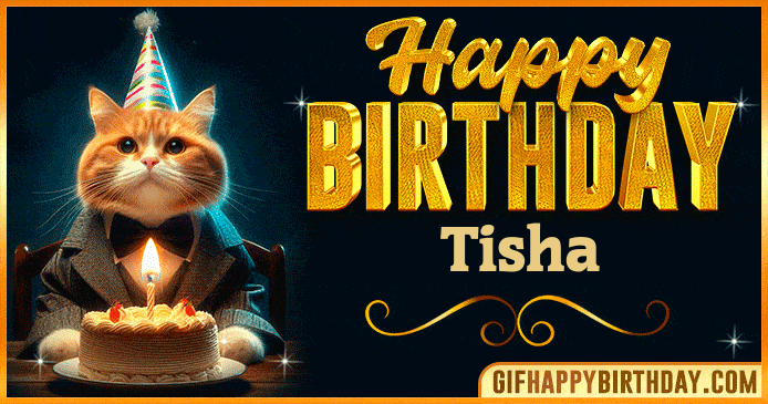 Celebrate Tisha’s special day with this elegant Happy Birthday GIF — a classy cat in a bow tie enjoying a birthday cake under warm lights. Perfect to share love, smiles, and birthday wishes! 🎂