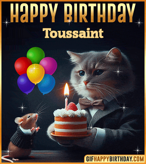 Celebrate Toussaint’s special day with this elegant Happy Birthday GIF — a classy cat in a bow tie enjoying a birthday cake under warm lights. Perfect to share love, smiles, and birthday wishes! 🎂