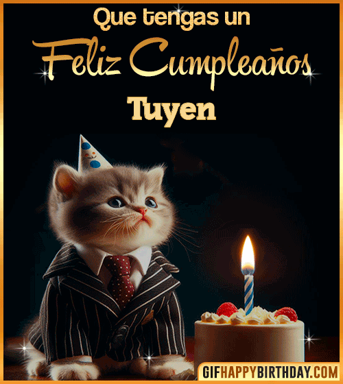 Celebrate Tuyen’s special day with this elegant Happy Birthday GIF — a classy cat in a bow tie enjoying a birthday cake under warm lights. Perfect to share love, smiles, and birthday wishes! 🎂