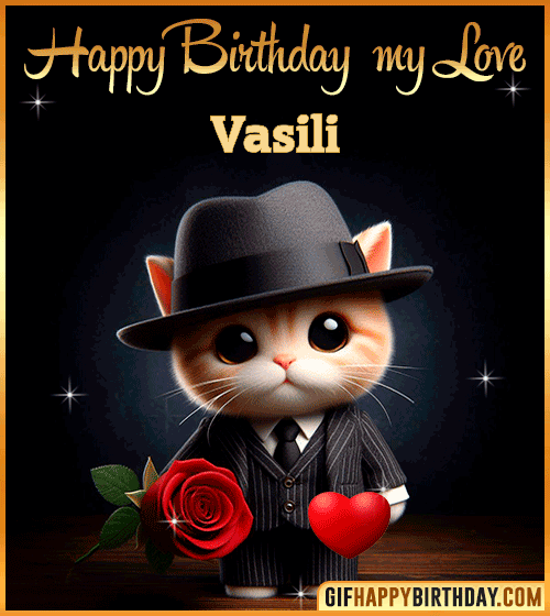 Surprise your special someone with this romantic Happy Birthday GIF! 💕🐾 A charming kitten dressed elegantly with a rose and heart sends warm, loving wishes to Vasili. Perfect to express affection, sweetness, and deep love on their special day. 🌹
