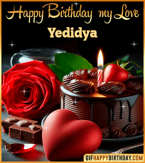 Make your special someone feel loved with this romantic Happy Birthday GIF! 💞🍰 A rich chocolate cake topped with strawberries and a glowing candle, beside a red rose and a heart — the perfect combination of sweetness and passion to say Happy Birthday, my love Yedidya! 🌹✨ Ideal to share heartfelt wishes filled with romance and tenderness.