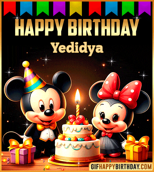 Brighten Yedidya’s special day with this cheerful Happy Birthday GIF — Mickey and Minnie Mouse smiling beside a festive cake, balloons, and presents. Perfect for sharing fun birthday vibes with friends and family! 🎂🎁🎈