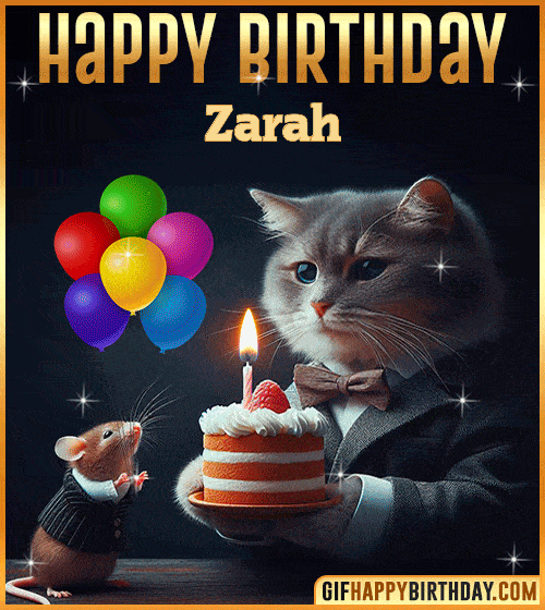 Celebrate Zarah’s special day with this elegant Happy Birthday GIF — a classy cat in a bow tie enjoying a birthday cake under warm lights. Perfect to share love, smiles, and birthday wishes! 🎂
